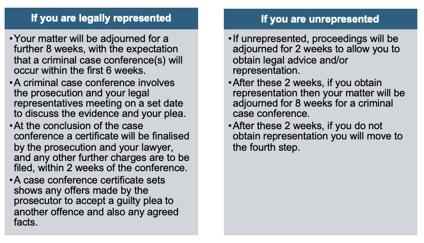 At the third step, a charge certificate is to be filed by the prosecution. Then if you are legally represented the the matter will be adjourned for up to a further 8 weeks so that a Case Conference can occur between the DPP and the Defence. This allows for negotiation between the parties.